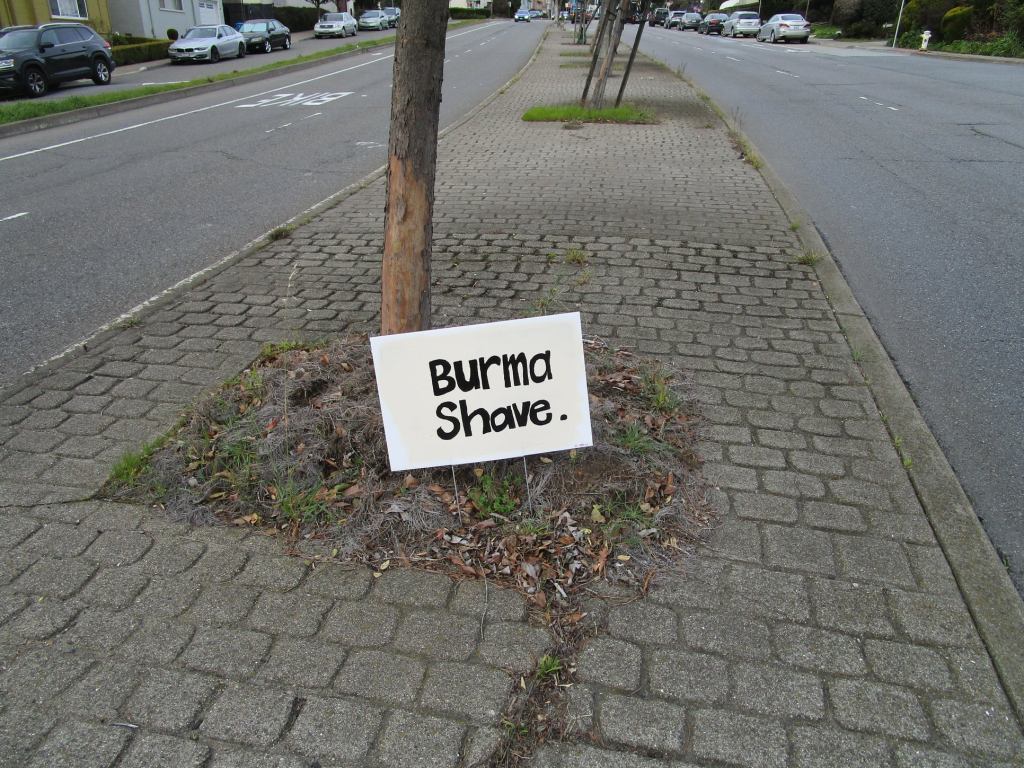 “Burma Shave.” Image • February 19, 2021 • zontaphotos Share this: Share on X (Opens in new window) X Share on Facebook (Opens in new window) Facebook Share on LinkedIn (Opens in new window) LinkedIn Like Loading... Related