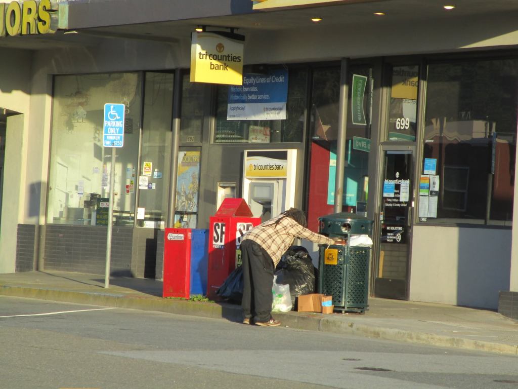 San Francisco resident searching through trash can at Portola Drive shopping center, February 2021 Image • February 28, 2021 • zontaphotos Share this: Share on X (Opens in new window) X Share on Facebook (Opens in new window) Facebook Share on LinkedIn (Opens in new window) LinkedIn Like Loading... Related