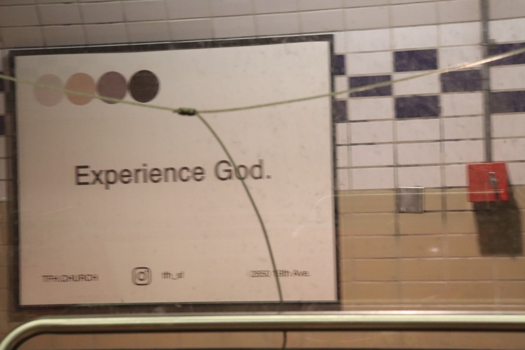 “Experience God” poster at Forest Hill station, San Francisco, September 2022 Image • September 11, 2022 • zontaphotos Share this: Share on X (Opens in new window) X Share on Facebook (Opens in new window) Facebook Share on LinkedIn (Opens in new window) LinkedIn Like Loading... Related