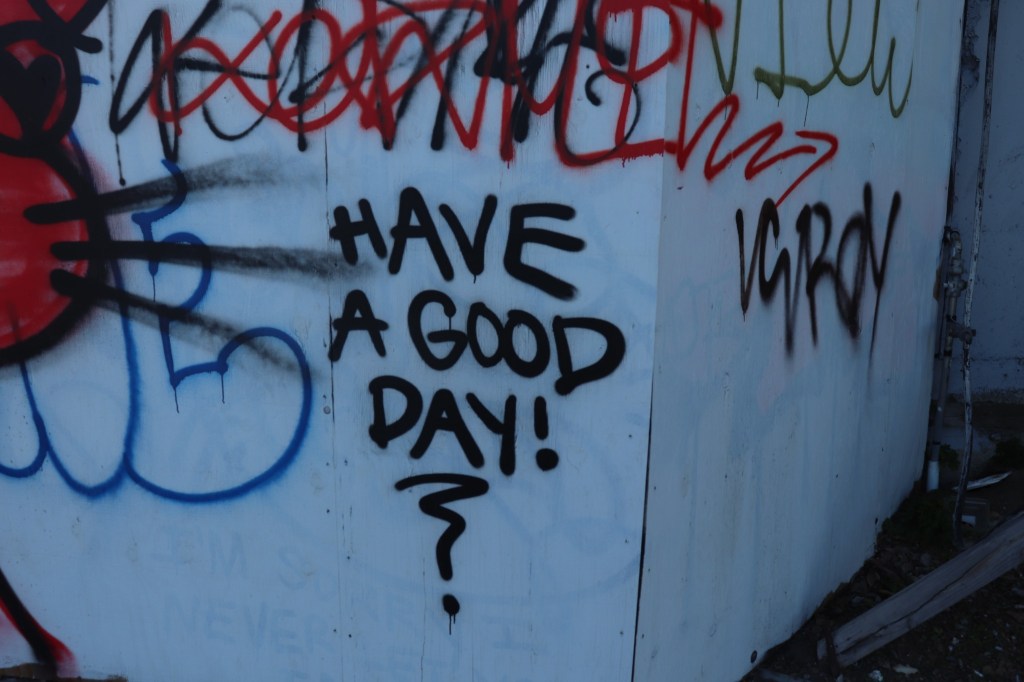 “Have a good day!” graffiti on upper Market Street, San Francisco, March 2023 Image • March 18, 2023 • zontaphotos Share this: Share on X (Opens in new window) X Share on Facebook (Opens in new window) Facebook Share on LinkedIn (Opens in new window) LinkedIn Like Loading... Related