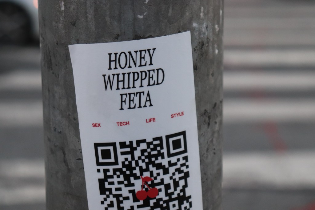 “Honey Whipped Feta” on San Francisco utility pole, October 2023 Image • November 6, 2023November 6, 2023 • zontaphotos Share this: Share on X (Opens in new window) X Share on Facebook (Opens in new window) Facebook Share on LinkedIn (Opens in new window) LinkedIn Like Loading... Related