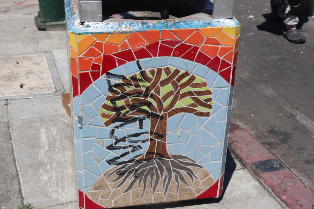 Tiled garbage can on Telegraph Avenue in Oakland, July 2024 Image • August 2, 2024 • zontaphotos Share this: Share on X (Opens in new window) X Share on Facebook (Opens in new window) Facebook Share on LinkedIn (Opens in new window) LinkedIn Like Loading... Related
